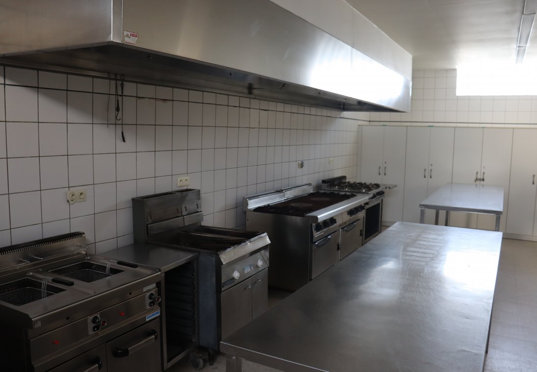 Aan de zaal is ook een professioneel uitgeruste keuken verbonden met fornuis, frituur, bain-marie, hete luchtoven, vaatwasmachine, ...