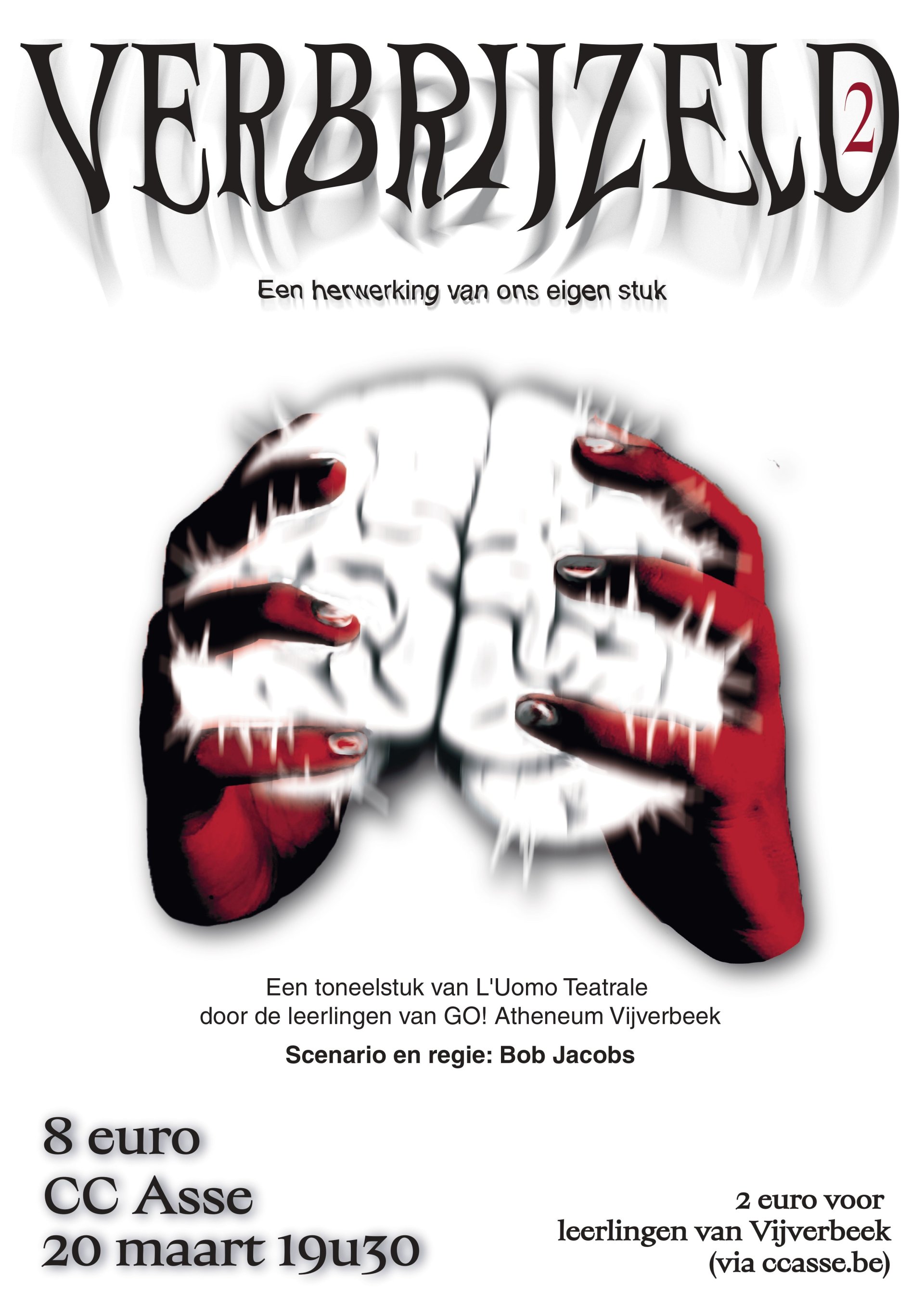 L'Uomo Teatrale, het theaterproject van GO! atheneum Vijverbeek, brengt dit jaar opnieuw een originele tragedie op de planken. Met Verbrijzeld2 brengen de leerlingen onder leiding van leerkracht en regisseur Bob Jacobs een herwerking van één van hun allereerste opvoeringen. Het is een desoriënterend verhaal waarin niets is wat het lijkt te zijn: wanneer een vrouw wakker wordt in haar bed - zonder geheugen en omringd door dokters en psychiaters - vormt dat de start van een verbijsterende rollercoaster.